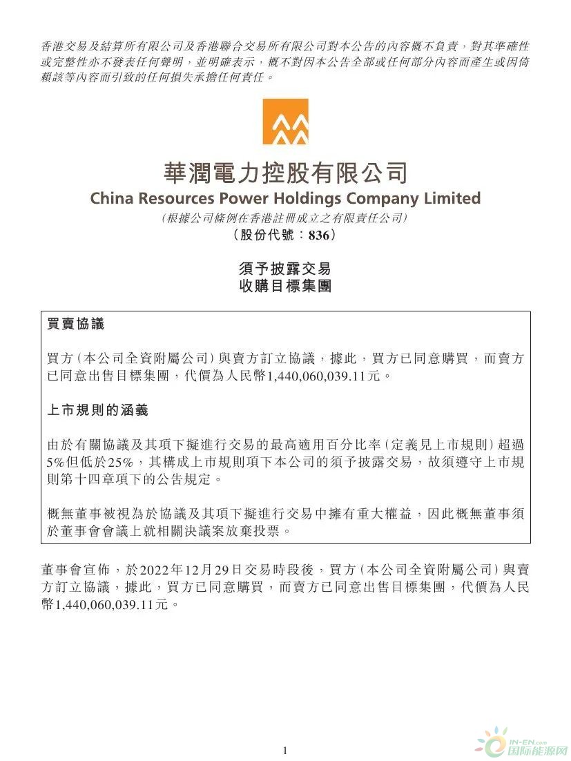 近日,华润电力称公司全资子公司华润新能源投资将以14.4亿元人民币的价格收购广东润能新能源有限公司(以下简称“广东润能”) 100%股权,交易完成后,公司将拥有超过44万千瓦的风电资产,作为公司向新能源转型的一次重大收购。
