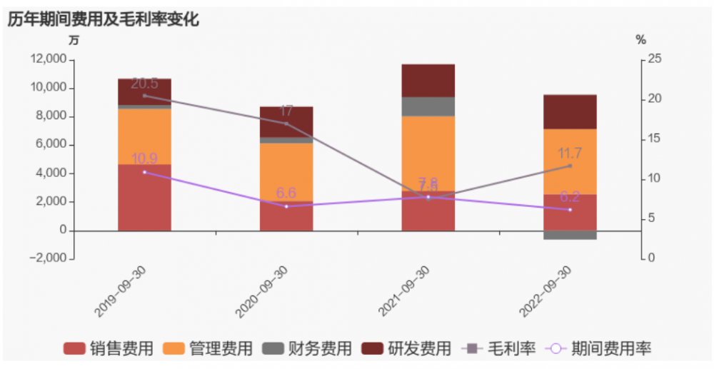 公司2022三季度营业成本12.66亿元,同比下降8.4%,高于营业收入4.1%的下降速度,毛利率上升4.2%。期间费用率为6.2%,较去年下降1.6%。