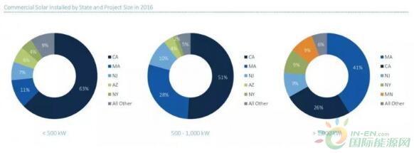 小型工商业光伏项目是市场的主流,在500KW以下的工商业分布式光伏市场以及500KW-1000MW的市场中,加州地区开发量最多,在1000KW以上的市场里,马萨诸塞州表现最好。