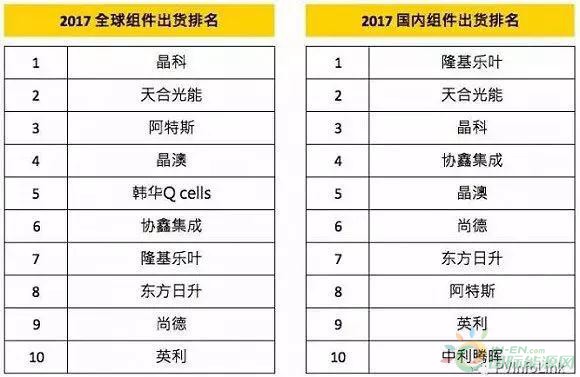 根据PVInfolink数据库统计,2017年全球组件出货排名前十强基本为中国企业。