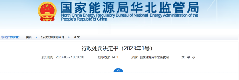 近日,国家能源局华北监管局发布行政处罚决定书(2023年1号)。