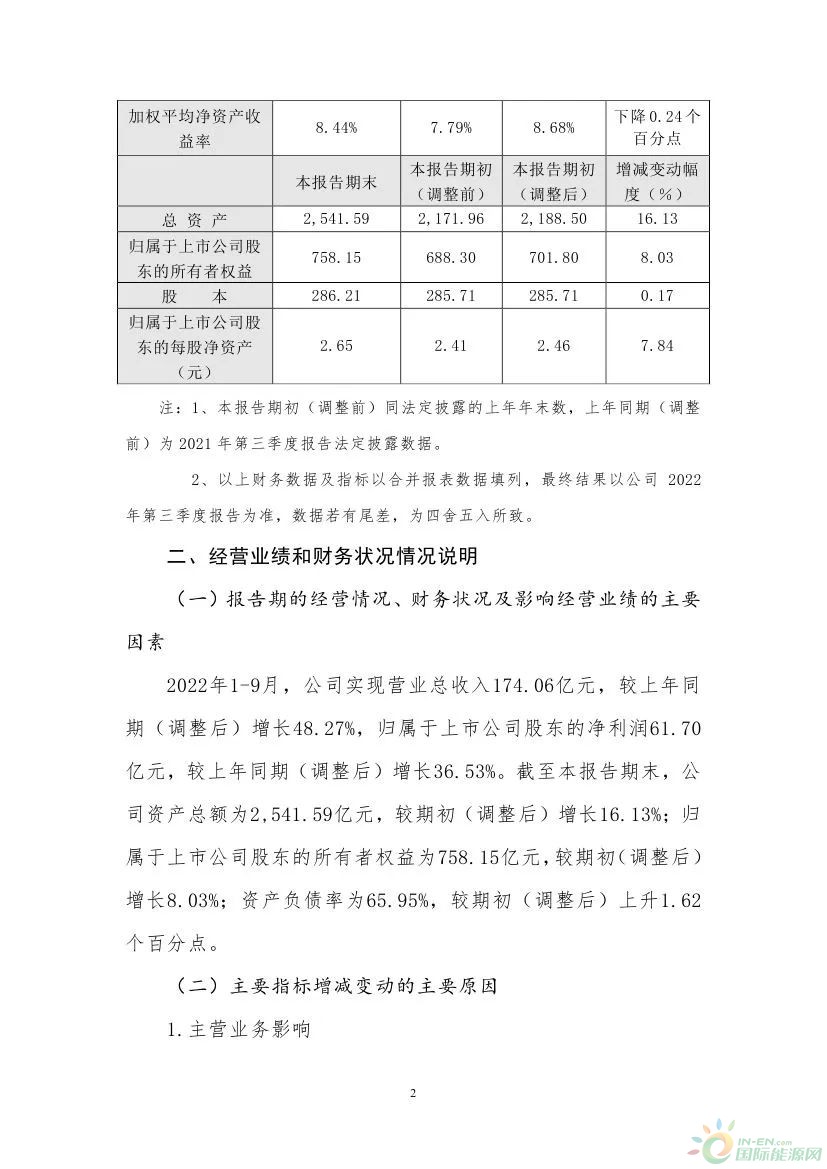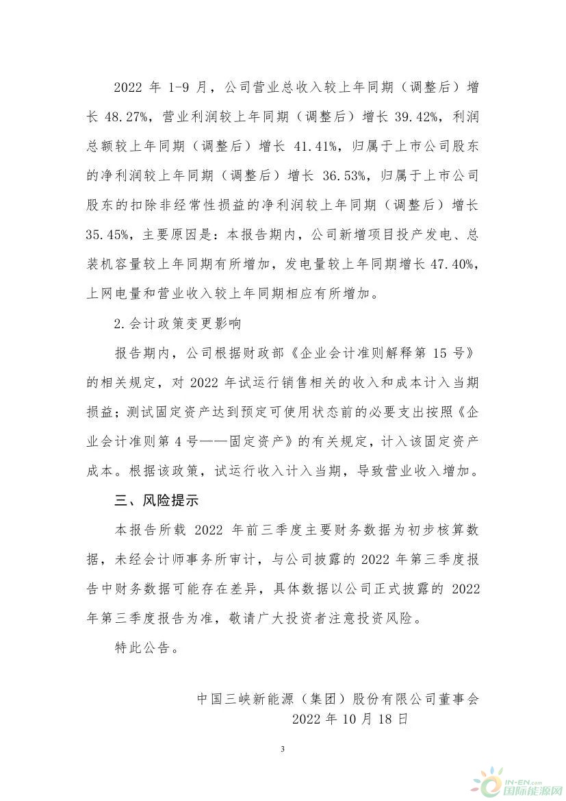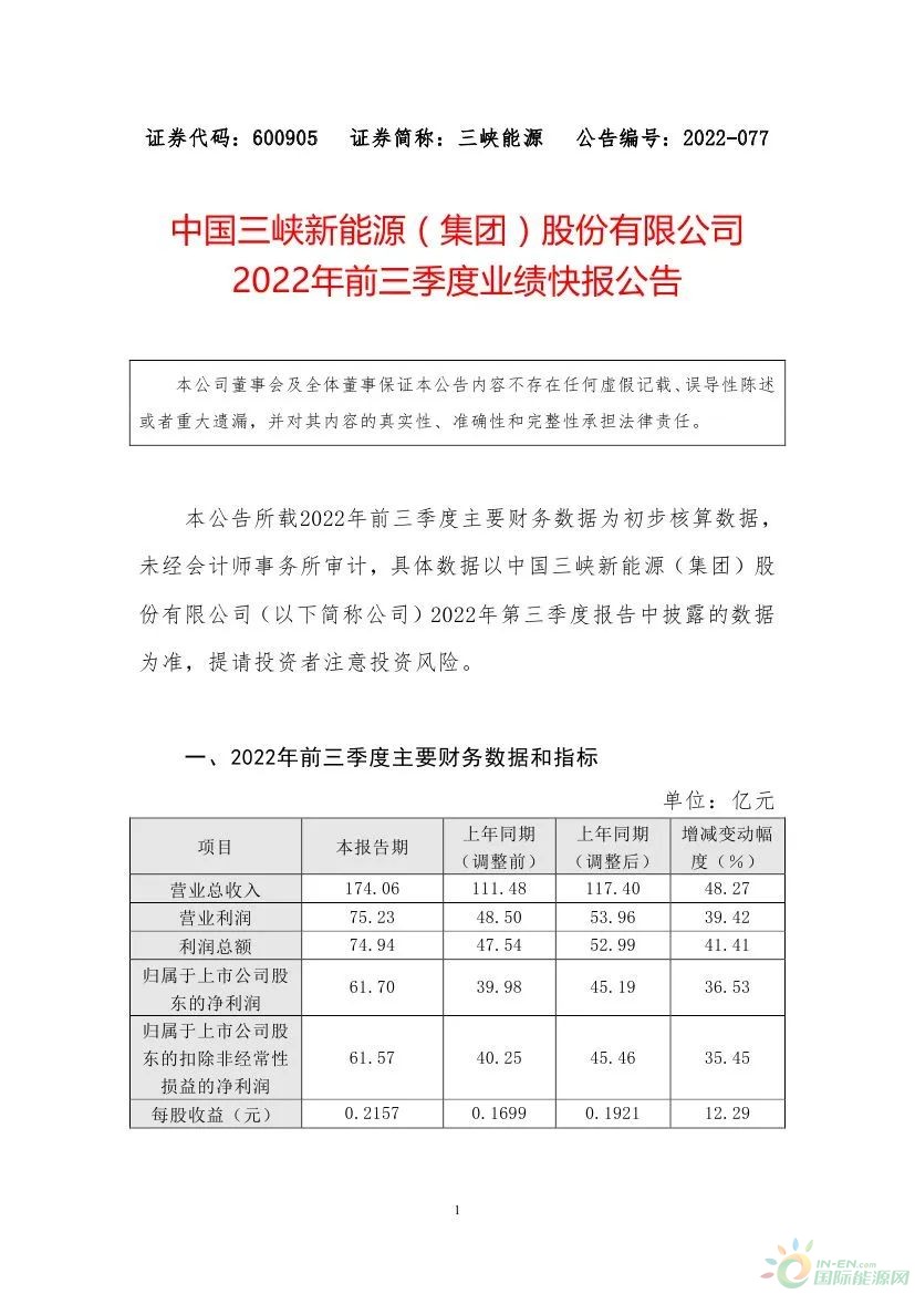 三峡能源发布2022前三季度业绩快报。2022年1-9月,实现营业总收入174.06亿元,较上年同期(调整后)增长48.27%,归属于上市公司股东的净利润61.70亿元,较上年同期(调整后)增长36.53%。截至本报告期末,公司资产总额为2,541.59亿元,较期初(调整后)增长16.13%。