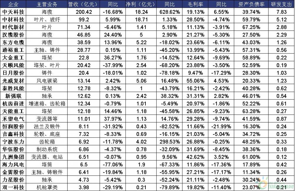 营收方面,25家零部件企业中,7家同比增长,海缆制造商中天科技,叶片、玻纤制造商中材科技、叶片商时代新材排名前三,分别为200.42亿元、99.2亿元和71.34亿元。