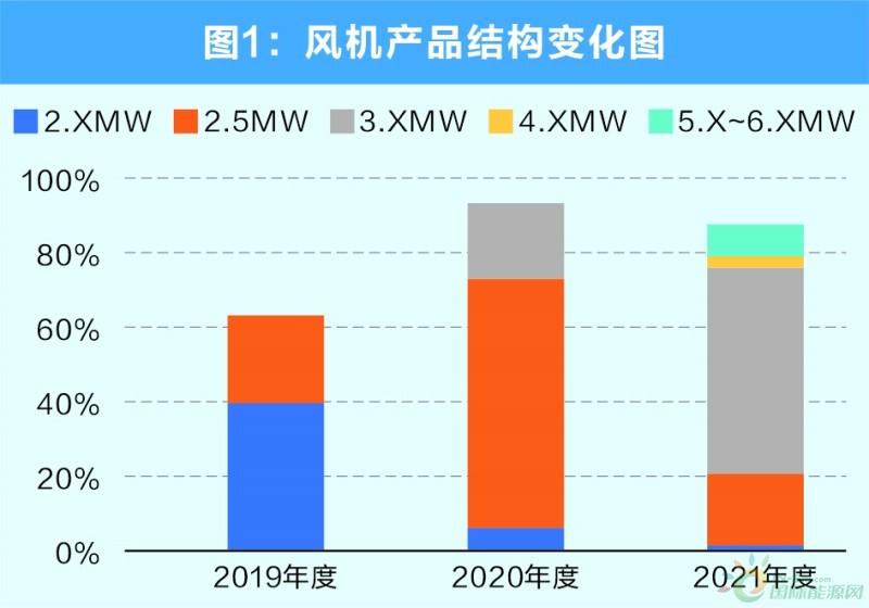 从产品结构来看,公司主力产品机型由2.XMW转化为2.5MW和3.XMM。具体来看,2019年2.XMW的风机销售占比为40.02%,2020年2.5XMW的风机销售占比为66.74%;到2021年,公司3.XMW的风机销售占比达55.17%,主力产品机型不断变化,风机大型化趋势明显。同时,公司已开发了4.XMW和5.XMW-6.XMW等大兆瓦机型,并于2021年实现销售收入3.01亿元和8.29亿元,占比分别为3%和8.26%(见图1)。