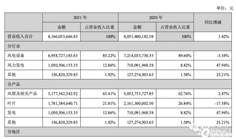 中国风电塔筒龙头天顺风能今日公布2021年年报。据披露,天顺风能2021年实现营业收入81.66亿元,同比2020年增长1.42%;净利润13.10亿元,同比增长24.76%。天顺风能目前塔筒产能合计约90万吨/年,2021年营收51.77亿元,毛利率为12.07。