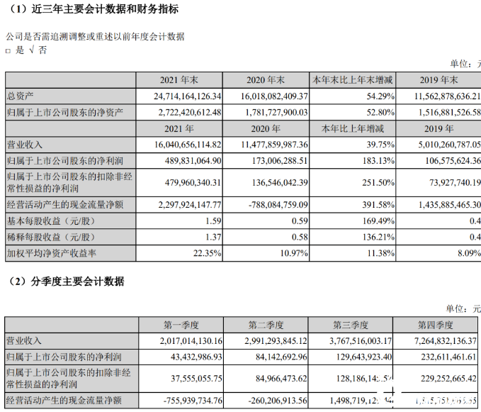 2021年报告期公司实现营收160.41亿元,同比增长39.75%;归母净利润4.9亿元,同比增长183.13%;扣非净利润4.8亿元,同比增长251.5%。基本每股收益1.59元。公司拟向全体股东每10股派发现金红利2.50元(含税),以资本公积金向全体股东每10股转增6股。。