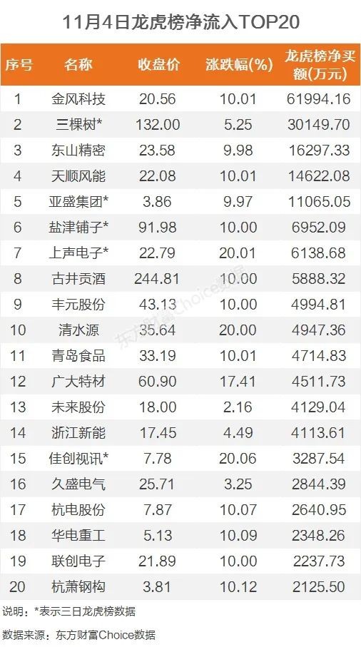 11月4日,上榜龙虎榜个股中,资金净流入最多的是金风科技,为6.2亿元。数据显示,该股日内涨停收盘,全天换手率8.92%,成交额60.81亿元。具体看,深股通净买入1.8亿元,宁波彩虹北路净买入1.7亿元。