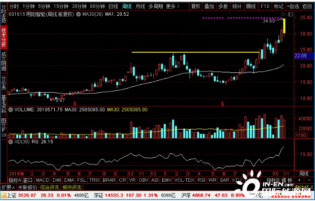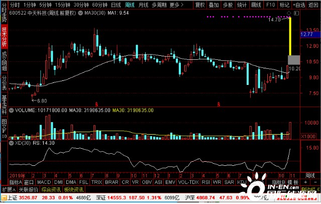 从目前来看,中天科技30周均线已经向上,价格也开始在均线上方运行,且创了近两年的新高,开始由之前的下坡期转为了爬坡期。