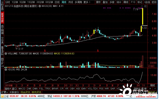 而在10月末吉鑫科技开始向上突破近两年新高,并且出现了连续涨停的走势。