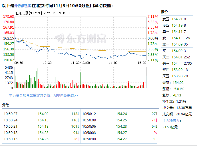 阳光电源11月3日盘中跌幅达5%