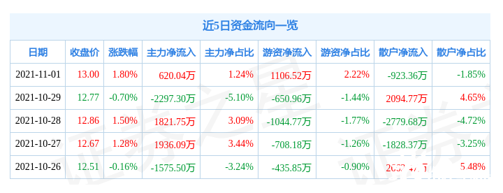 资金流向数据方面,当日主力资金净流入620.04万元,游资资金净流入1106.52万元,散户资金净流出923.36万元。近5日资金流向一览见下表: