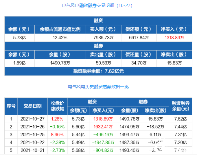 2021年10月27日融资净买入1318.89万元;融资余额5.73亿元,较前一日增加2.36%