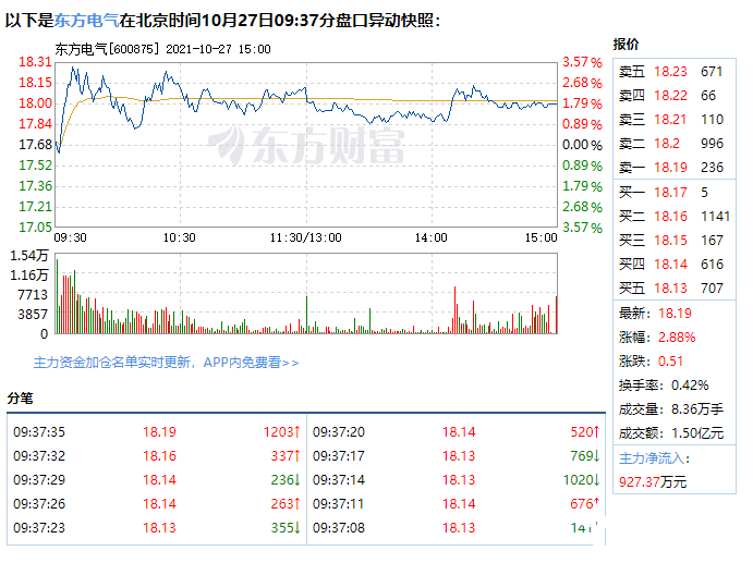 盘中快速上涨,5分钟内涨幅超过2%,截至9点37分,报18.19元,成交1.50亿元,换手率0.42%。