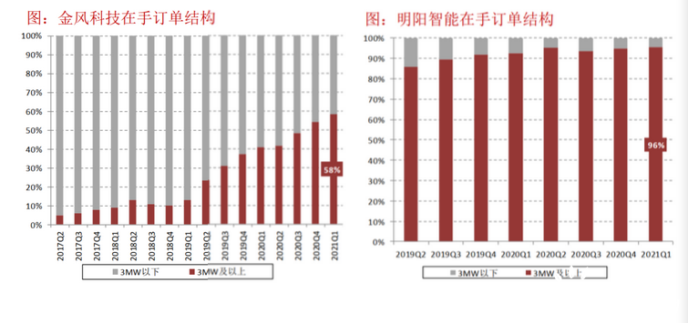 从2021年开始,大功率风机已经广泛应用于平价项目。以金风科技、明阳智能为例,其在手订单中,3MW及以上的机型占比为58%、96%。换言之,陆上风电1.5MW、2MW风机的时代基本成为历史。