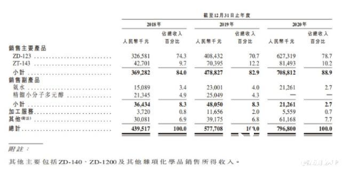 招股书显示,正大新材料中国最大的聚醚胺产品制造商,主要以“正大新材”品牌从事聚醚胺产品的研发、生产及销售。公司的产品组合,分为三大类,即单胺、二胺及三胺(其差别乃由产品的核心聚醚主链结构确定),三者均可根据化学结构基于环氧丙烷(PO)、环氧乙烷(EO)或两者的混合比例进一步分类。公司的主要产品为ZD-123及ZT-143,两种产品于2020年实现营收7.09亿元(人民币)占营收比重达到88.9%。