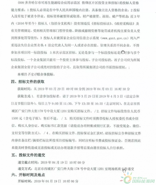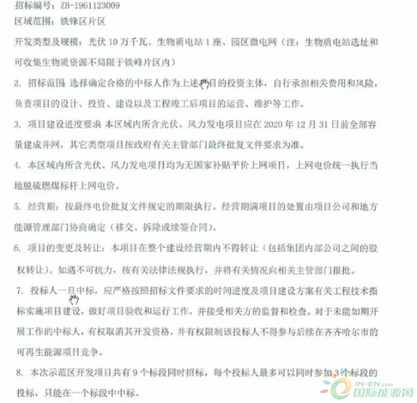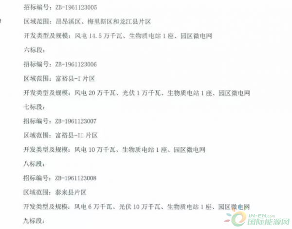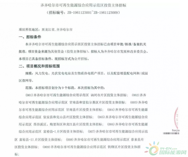 3月29日,中国招标投标公共服务平台上发布了《齐齐哈尔市可再生能源综合应用示范区投资主体招标》公告。根据招标公告,此次招标项目共分为9个标段,包括风电2.52GW、光伏480MW、生物质电站9座以及园区微电网。