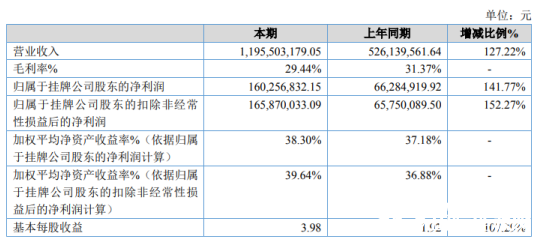 飞沃科技近日发布2020年度报告,报告期内公司实现营业收入1,195,503,179.05元,同比增长127.22%;归属于挂牌公司股东的净利润160,256,832.15元,同比增长141.77%。
