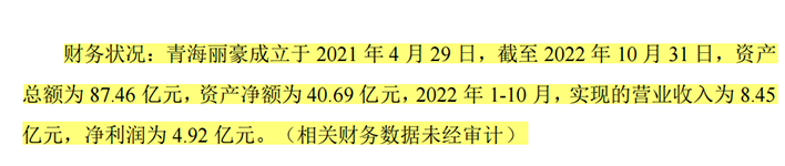 公告同步披露了青海丽豪未经审计的相关财务数据,截至2022年10月31日,青海丽豪资产总额为87.46亿元,资产净额为40.69亿元,2022年1-10月,其实现的营业收入为8.45亿元,净利润为4.92亿元。