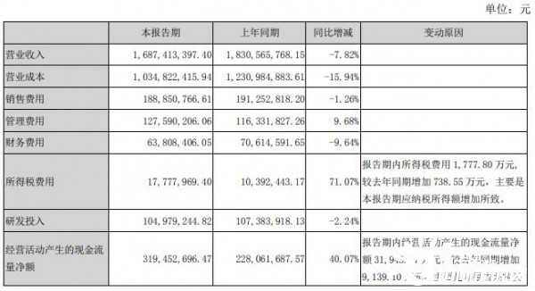 报告期内,公司实现营业收入168,741.34万元,较去年同期下降7.82%;实现归属于上市公司股东的净利润13,315.65万元,较去年同期增长46.88%;实现归属于上市公司股东的扣除非经常性损益的净利润11,924.82万元,较去年同期增长71.94%。