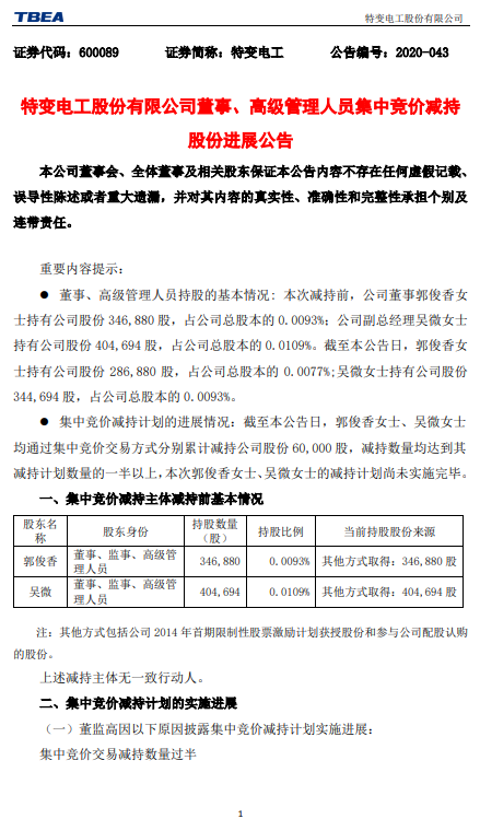 国际能源网获悉,特变电工发布《董事、高级管理人员集中竞价减持股份进展公告》。