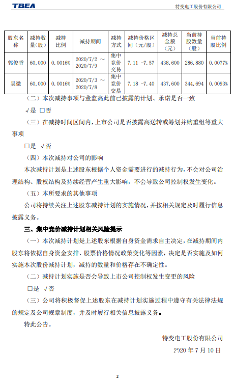 另外,特变电工表示,本次减持计划是上述股东根据个人资金需要进行的减持行为,不会对公司治理结构、股权结构及持续经营产生重大影响,不会导致公司控制权发生变化。