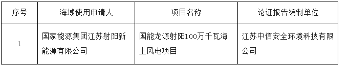 根据《海域使用权管理规定》第十八条和自然资源部《关于规范海域使用论证材料编制的通知》(自然资规〔2021〕1号)等有关规定,现对国能龙源射阳100万千瓦海上风电项目用海申请信息进行公示(项目清单如下)。