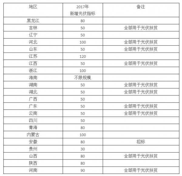 根据上述规划,“各省(区、市)2017年度新增建设规模优先建设光伏扶贫电站,不再单独下达集中式光伏扶贫电站规模;河北、山东、河南、江西、湖南、湖北、云南、广东等提前使用2017年建设规模超过50万的省份新增建设规模全部用于建设光伏扶贫电站”,也就是说2017年集中式光伏扶贫电站指标将在各省的新增建设规模中统筹考虑,针对集中式光伏扶贫电站将不会再重新下达额外指标。