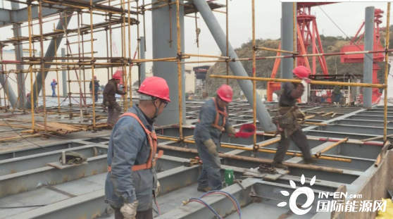 放眼望去,施工现场尽是弯腰低头焊接,手提肩扛运材的忙碌身影。这座海上升压站共有4层甲板面,目前已完成主框架和1、2层甲板面拼装,正在进行第3层结构拼装,再有3个月左右,这座海上升压站将从宁波出发,整体运送至我县金乡区域外海进行调试。