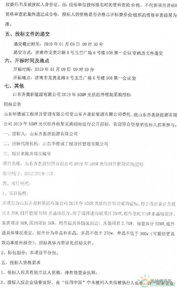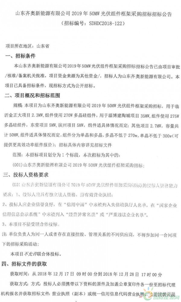 山东齐奥新能源有限公司2019年50MW光伏组件框架采购招标
