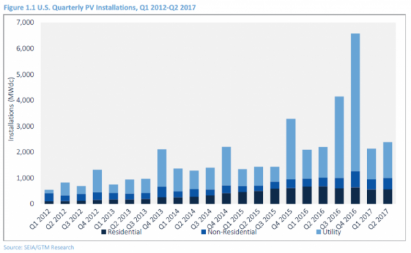 根据某市场研究机构和美国太阳能行业协会(SEIA)的一份新报告,2017年二季度,美国部署2.4吉瓦太阳能光伏,同比增长8%。