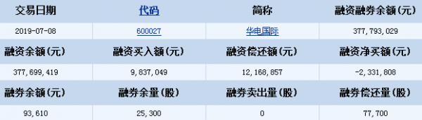 华电国际2019年7月8日融资融券信息显示,华电国际融资余额377,699,419元,融券余额93,610元,融资买入额9,837,049元,融资偿还额12,168,857元,融资净买额-2,331,808元,融券余量25,300股,融券卖出量0股,融券偿还量77,700股,融资融券余额377,793,029元。华电国际融资融券详细信息如下表:
