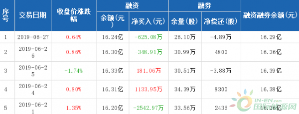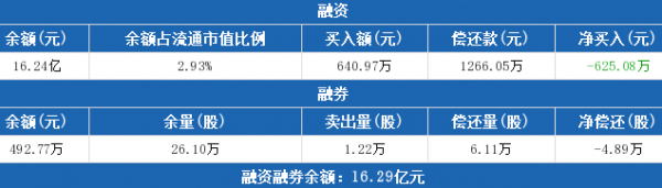 融资方面,6月27日融资买入640.97万元,融资偿还1266.05万元,融资净偿还625.08万元。融券方面,融券卖出1.22万股,融券偿还6.11万股,融券余量26.1万股,融券余额492.77万元。融资融券余额合计16.29亿元。