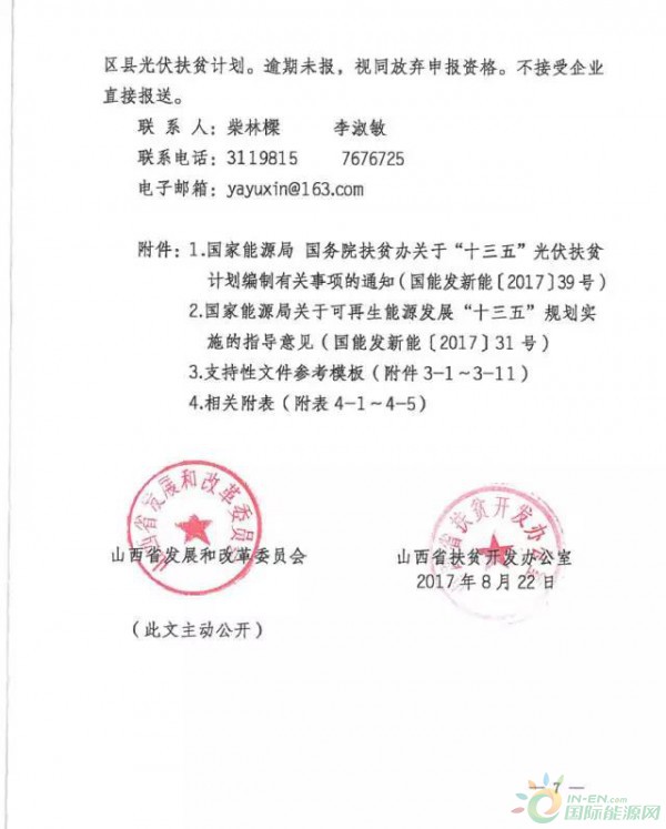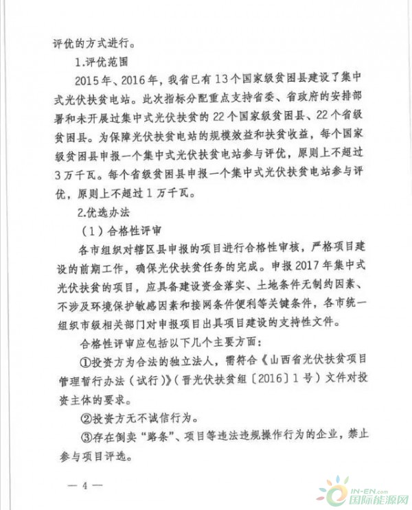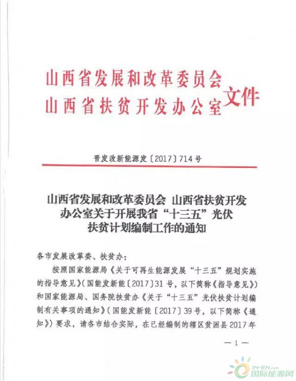 8月22日,山西发改委、山西扶贫办联合下发《关于开展我省”十三五“光伏扶贫计划编制工作的通知》要求10个深度贫困县,3350个深度贫困村一次性完成光伏扶贫计划;单个村级电站电量为300千瓦左右。对于2017年国家能源局下达山西省的80万千瓦光伏建设指导规模全部用于集中式光伏扶贫电站,并将委托第三方采取评优方式进行。