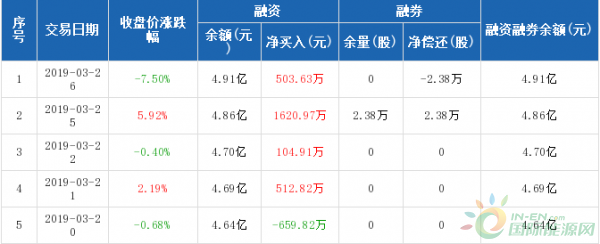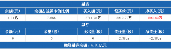 融资方面,当日融资买入3714.34万元,融资偿还3210.7万元,融资净买入503.63万元,连续4日净买入累计2742.33万元。融券方面,融券卖出0股,融券偿还2.38万股,融券余量0股,融券余额0元。融资融券余额合计4.91亿。