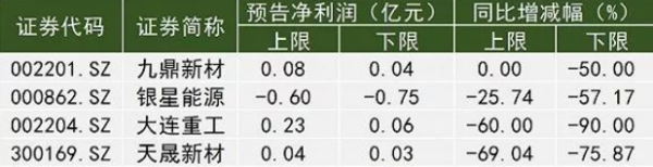 九鼎新材、银星能源、大连重工、天晟新材预计今年前三季度净利润同比去年下滑。其中,银星能源亏损,预计前三季度归属于上市公司股东的净利润变动范围为-0.75亿元至-0.6亿元,同比去年下滑25.74%至57.17%。银星能源在预告中解释,由于三季度风资源状况较差,风电机组运行小时减少,并且其装备制造业同比销量下降幅度较大,由此造成续亏情况。