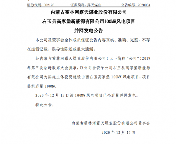 露天煤业发布公告,经公司2019年第三次临时股东大会批准,以公司全资子公司右玉县高家堡新能源有限公司为实施主体投资建设山西右玉高家堡100MW风电项目,项目装机容量100MW。2020年12月15日该100MW风电项目已全容量并网发电。 公告如下: