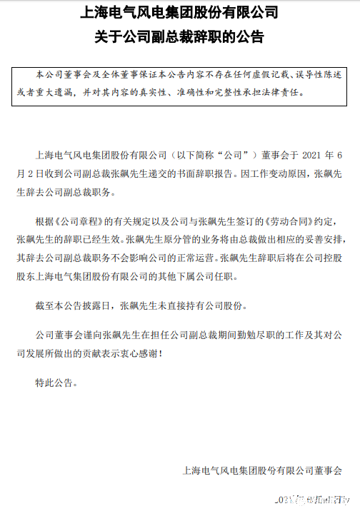 先生辞职后将在公司控股股东上海电气集团股份有限公司的其他下属公司任职。