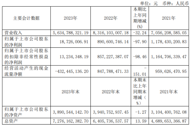 国际能源网获悉,4月25日,胜华新材发布2023年全年业绩报告。2023年公司实现营业收入56.35亿元,同比减少32.24%;实现归属于上市公司股东的净利润0.19亿元,同比减少97.90%;每股收益0.09元。