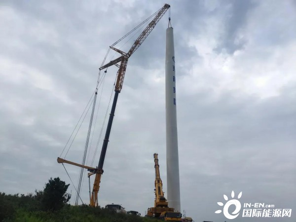 该项目总装机容量49.5兆瓦,规划安装11台金风2.5兆瓦和9台金风2.X兆瓦机组,此次吊装的2.X兆瓦塔筒分四段组成,单段塔筒最长22米,最重70.5吨,塔筒总高90米,最大直径4.6米,单套工程量约170吨。