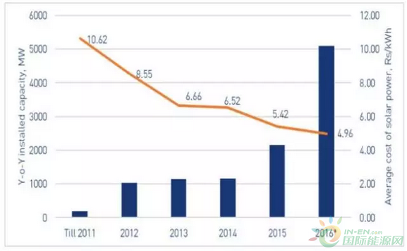 而光伏平均成本也一路下滑,从2011年的10.62卢比/千瓦时,降至2016年的4.96卢比/千瓦时,相当于7.4美分/千瓦时。