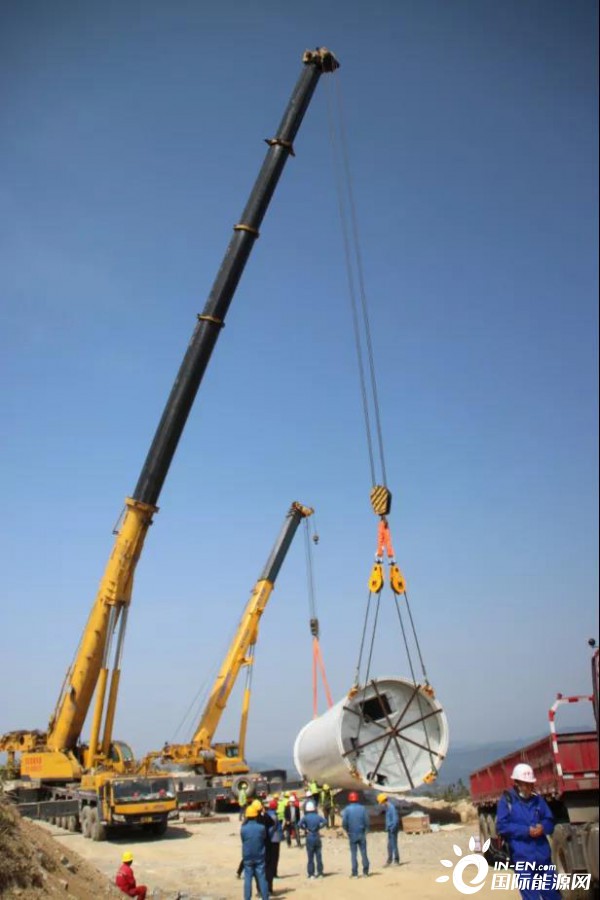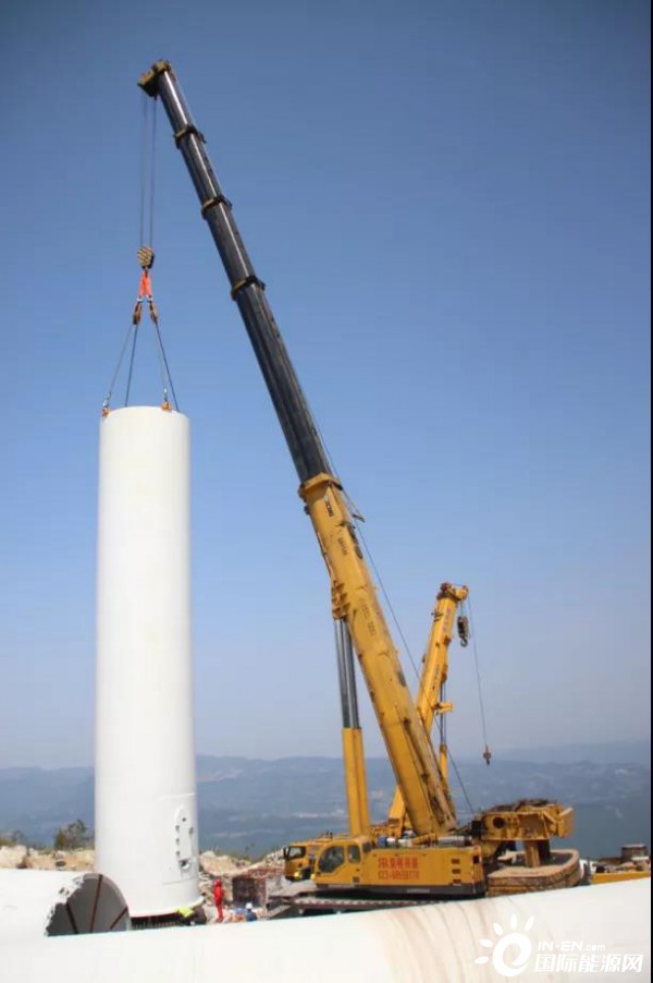 随着现场吊装指挥员的一声令下,一台600吨,一台400吨,以及两台百吨级的吊车开始缓缓吊动缆绳,首节塔筒犹如春笋破土般稳稳的矗立在了齐岳山顶。