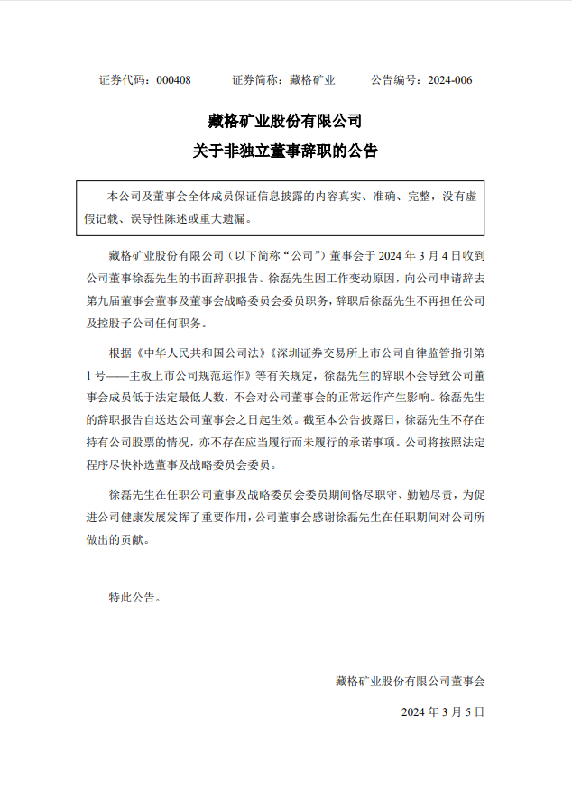 公告显示,藏格矿业董事会于2024年3月4日收到公司董事徐磊先生的书面辞职报告。徐磊先生因工作变动原因,向公司申请辞去第九届董事会董事及董事会战略委员会委员职务,辞职后徐磊先生不再担任公司及控股子公司任何职务。
