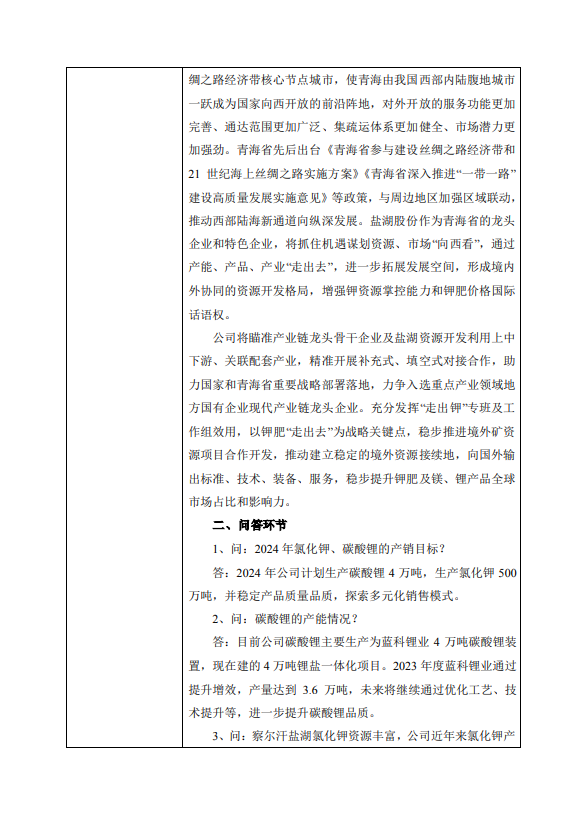 国际能源网获悉,近日,盐湖股份于最新的投资者关系活动记录表中表示,2024年公司计划生产碳酸锂4万吨,生产氯化钾500万吨,并稳定产品质量品质,探索多元化销售模式。关于与比亚迪合作的3万吨项目进展,公司表示目前由比亚迪公司主导进行的中试工作还在进行中。