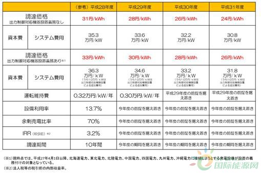关于光伏发电的收购价格,10kW以下的住宅用系统为28日元/kWh(无设置输出功率控制设备义务)和30日元/kWh(有设置义务);10kW以上的非住宅用系统为21日元/kWh。2MW以上系统的收购价格,由竞标方式确定。收购期维持不变,仍为住宅用10年,非住宅用20年。