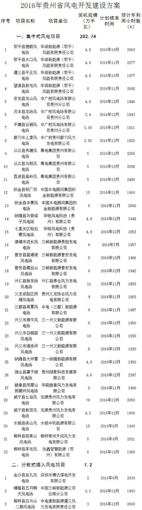 一、为促进风电产业持续健康发展,2016年贵州省风电开发建设总规模209.94万千瓦,其中集中式风电项目规模202.74万千瓦,分散式接入风电项目规模7.2万千瓦。