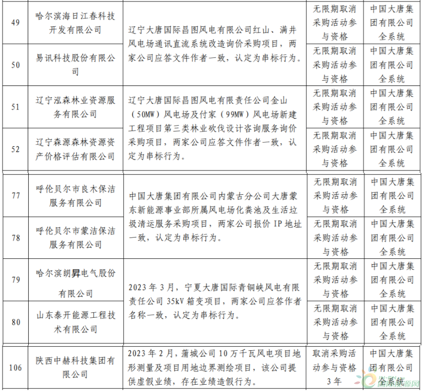 国际能源网/风电头条(微信号:wind-2005s)获悉,近日,大唐集团发布2023年第5批关于供应商不良行为处理情况的公告,共有119家企业被点名。