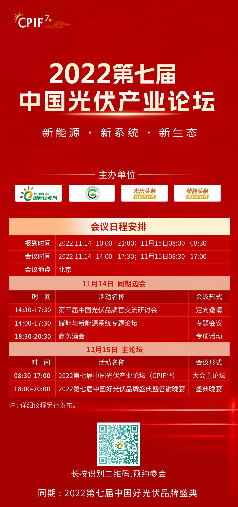 11月14-15日,以“新能源 新系统 新生态”为主题的“2022第七届中国光伏产业论坛(CPIF7th)”将在北京举办。论坛将聚焦新型电力系统、新能源大基地、整县光伏、分布式光伏、光储融合等热点话题,搭建价值型平台,充分展示、交流行业创新技术、成果、经验,助力实现新能新生态,致力于把绿色能源价值顺利传导至终端用户。