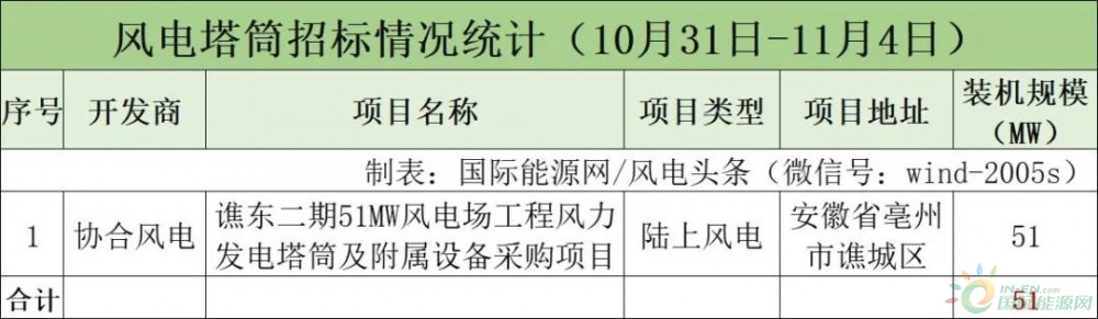 国际能源网/风电头条(微信号:wind-2005s)不完全统计,本周风电塔筒招标市场方面,共有1个项目51MW塔筒启动招标,项目为谯东二期51MW风电场工程风力发电塔筒及附属设备采购项目,开发商为协合风电。