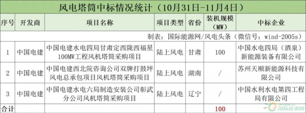 开标项目分别是中国电建水电四局甘肃定西陇西福星100MW工程风机塔筒采购项目、中国电建西北院咨询公司双牌打鼓坪风电总承包项目风机塔筒采购项目、中国电建水电六局制造安装公司彰武分公司风机塔筒采购项目,中标企业分别是中国水电四局(酒泉)新能源装备有限公司、苏州天顺新能源科技有限公司、中国水利水电第四工程局有限公司。