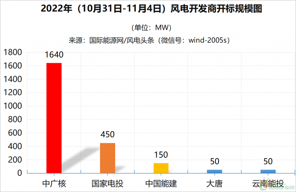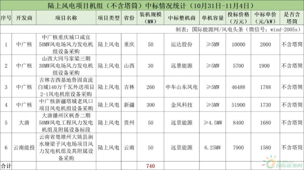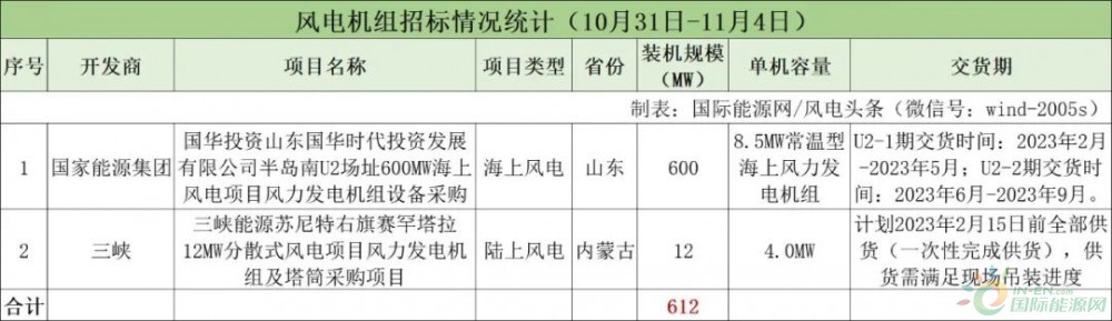 据国际能源网/风电头条(微信号:wind-2005s)统计,本周(10月31日-11月4日)风电整机采购开标总计2340MW(约2.34GW),风电机组招标总计612MW。